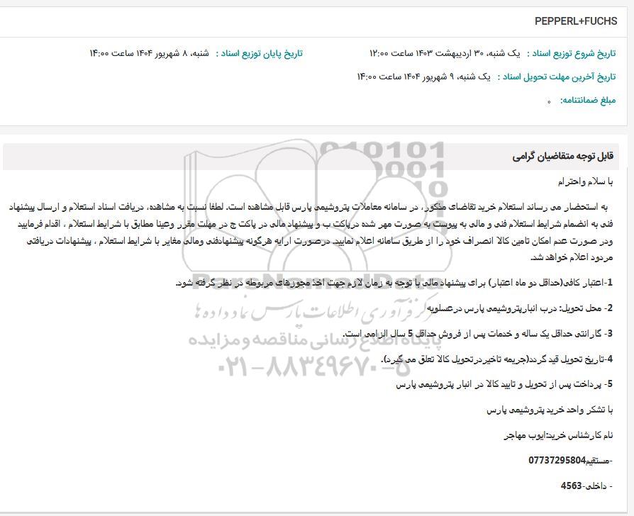 به استحضار میرساند استعلام خرید تقاضای مذکور در سامانه معاملات پتروشیمی پارس قابل مشاهده است. لطفا نسبت به مشاهده دریافت اسناد استعلام و ارسال پیشنهاد فنی به انضمام شرایط استعلام فنی و مالی به پیوست به صورت مهر شده در پاکت ب و پیشنهاد مالی در پاکت ج در مهلت مقرر وعينا مطابق با شرایط استعلام ، اقدام فرمایید و در صورت عدم امکان تامین کالا انصراف خود را از طریق سامانه اعلام نمایید در صورت ارایه هرگونه پیشنها دفنی و مالی مغایر با شرایط استعلام ، پیشنهادات دریافتی مردود اعلام خواهد شد.