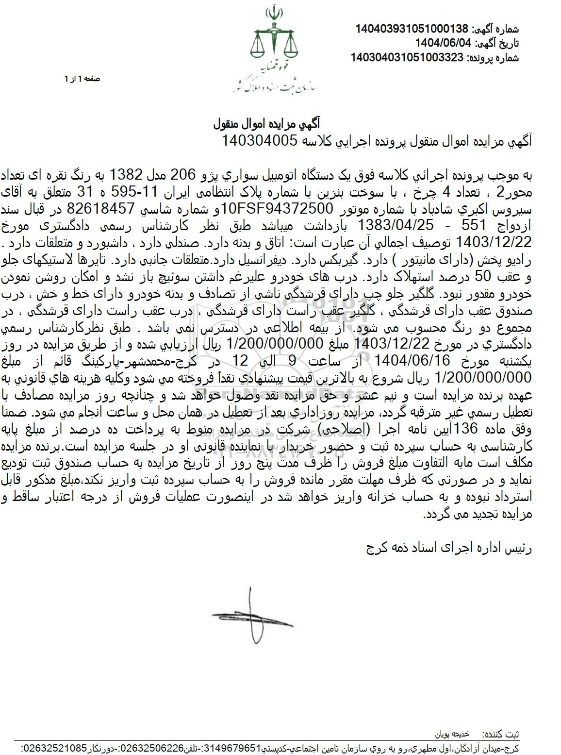 مزایده فروش یک دستگاه اتومبیل سواری پژو 206 مدل 1382