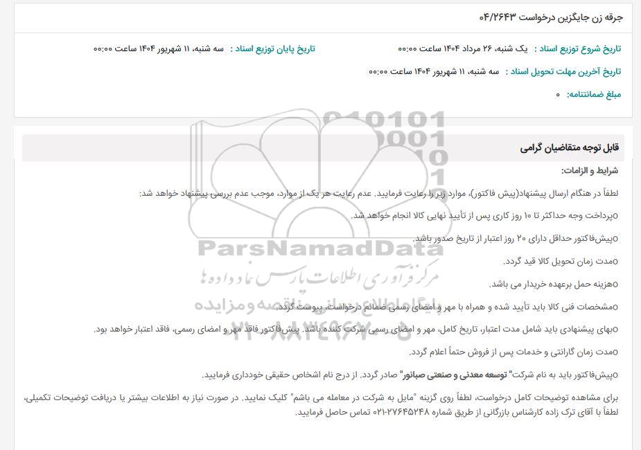 نحوه دریافت اسناد و ارسال پیشنهاد: متقاضیان می‌توانند با ثبت نام در سامانه مناقصات و مزایدات ایران (پارس نماد) نسبت به مشاهده اسناد استعلام، دریافت اطلاعات تکمیلی، و ثبت پیشنهاد قیمت خود اقدام نمایند. در صورت نیاز به دریافت راهنمایی یا پشتیبانی در خصوص استعلام و مناقصه و فراخوان مناقصه عمومی، مناقصه محدود، مناقصه بین‌ المللی، مناقصه دولتی، مناقصه خصوصی، مناقصه آنلاین فروش تجهیزات، مناقصه مشاوره‌ای مناقصه پتروشیمی و انرژی مناقصه صنایع و تجهیزات برق و مخابرات و نفت و گاز ... لطفاً با سایت خبری مناقصه و مزایده پارس‌نماد داده‌ها به شماره 88349670 تماس حاصل فرمایید.