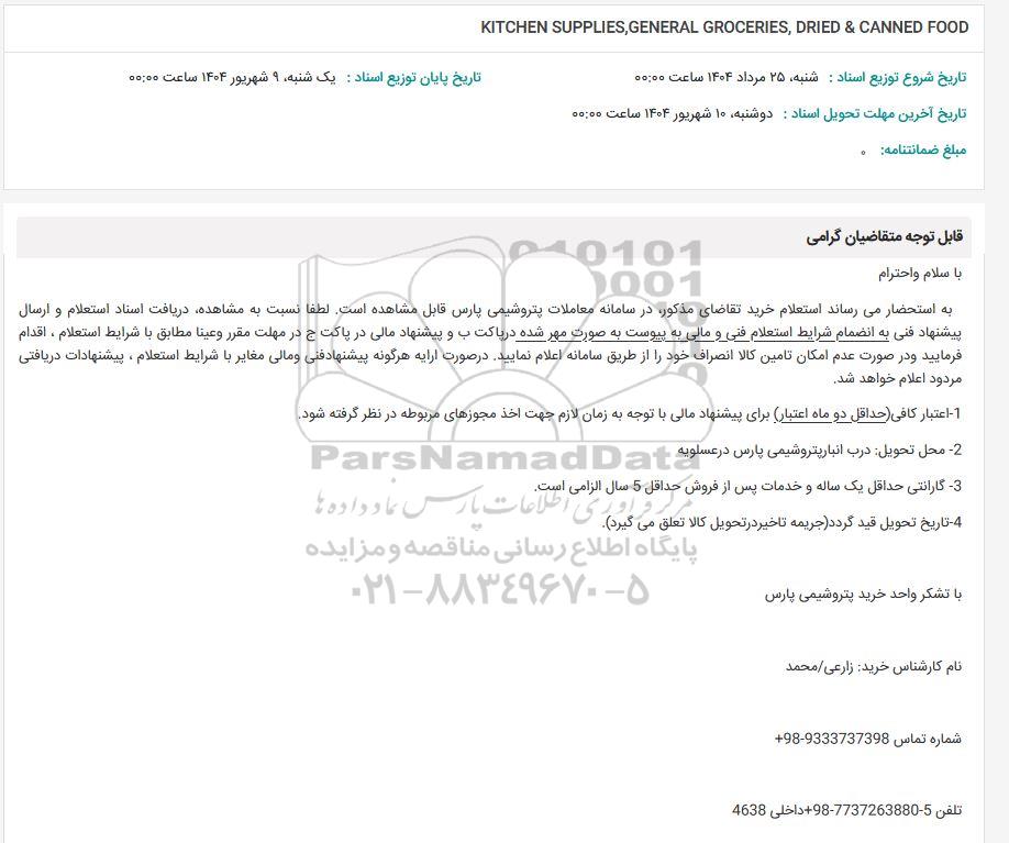 به استحضار می رساند استعلام خرید تقاضای مذکور در سامانه معاملات پتروشیمی پارس قابل مشاهده است. لطفا نسبت به مشاهده دریافت اسناد استعلام و ارسال پیشنهاد فنی به انضمام شرایط استعلام فنی و مالی به پیوست به صورت مهر شده در پاکت ب و پیشنهاد مالی در پاکت ج در مهلت مقرر وعينا مطابق با شرایط استعلام ، اقدام فرمایید و در صورت عدم امکان تامین کالا انصراف خود را از طریق سامانه اعلام نمایید. در صورت ارایه هرگونه پیشنها دفنی و مالی مغایر با شرایط استعلام، پیشنهادات دریافتی مردود اعلام خواهد شد.