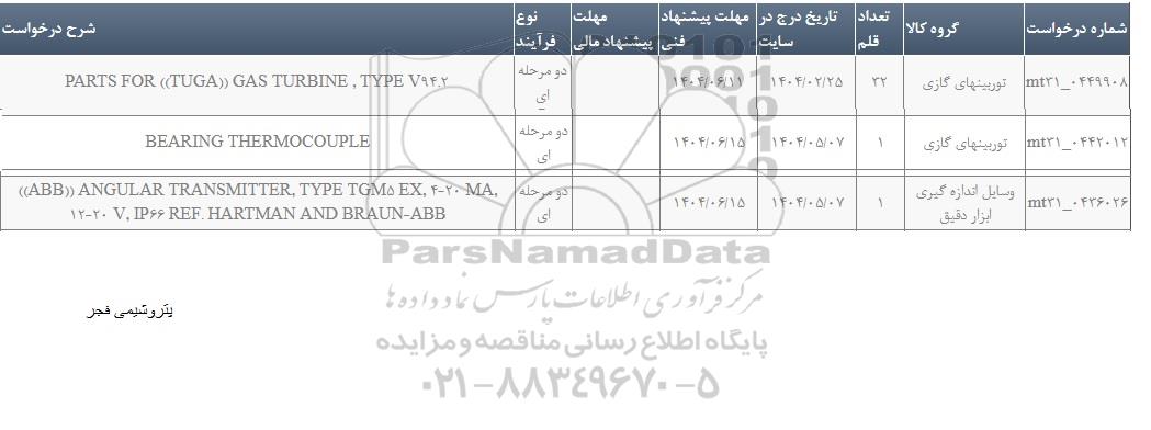 استعلام بها و موضوع استعلام استعلام PARTS FOR ANSALDO GAS TURBINE, TYPE V94.2... به اطلاع کلیه شرکت‌ها و افراد متخصص واجد شرایط می‌رساند، آگهی گذار در نظر دارد از طریق استعلام بها، نسبت به انتخاب و دریافت پیشنهادات اقدام نماید. این استعلام با کد آگهی ثبت شده در سامانه خبرگزاری پارس نماد : 9466544 منتشر شده است. مشخصات استعلام : تاریخ شروع استعلام: 1404/06/05 آخرین مهلت ارسال پیشنهاد قیمت : 1404/06/15 و محل اجرای پروژه : استان سایر میباشد. استعلام قیمت مورد درخواست : استعلام PARTS FOR ANSALDO GAS TURBINE, TYPE V94.2... با دسته‌بندی‌های تخصصی و گروه های مرتبط : ابزار دقیق, انواع توربین های بادی و آبی و غیره, انواع بلبرینگ و رولبرینگ, ترانسفورماتور, نیروگاه, تجهیزات نفت و گاز, تجهیزات برق و الکترونیک, استعلام اطلاع رسانی میگردد. شرایط شرکت در استعلام آنلاین : ابتدا ثبت نام در سامانه استعلام پارس نماد و تکمیل مدارک موردنیاز و بارگذاری در سامانه رعایت تمامی ضوابط و الزامات مندرج در اسناد استعلام است.
