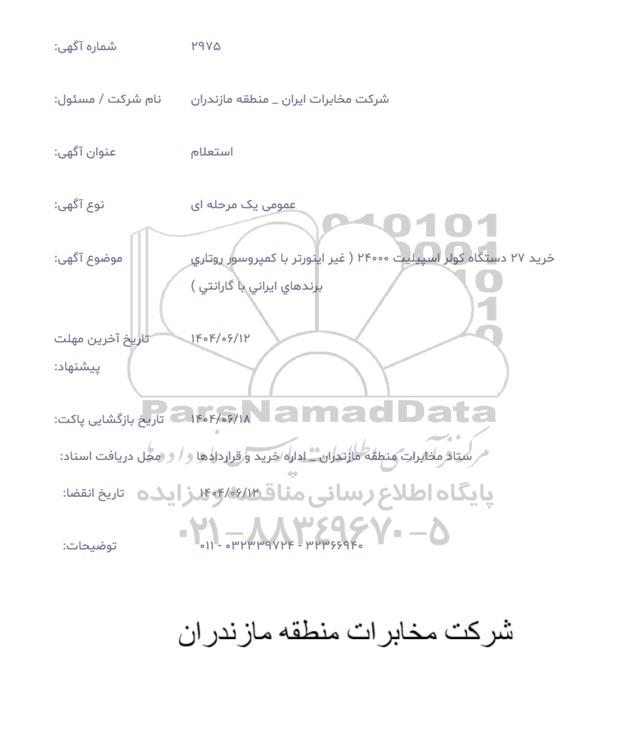 موضوع آگهی: خرید27 دستگاه کولر اسپیلیت 24000 (غیر اینورتر با کمپروسور روتاری برندهای ایرانی با گارانتی)