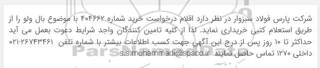 شرکت پارس فولاد سبزوار در نظر دارد اقلام درخواست خرید شماره 404662 با موضوع بال ولو را از طريق استعلام کتبی خریداری نماید. لذا از کلیه تامین کنندگان واجد شرایط دعوت بعمل می آید حداکثر تا 10 روز پس از درج این آگهی جهت کسب اطلاعات بیشتر با شماره تلفن 26743461-021 داخلی 1270 تماس حاصل نمایند. s.s.mohammadi@spsco.ir