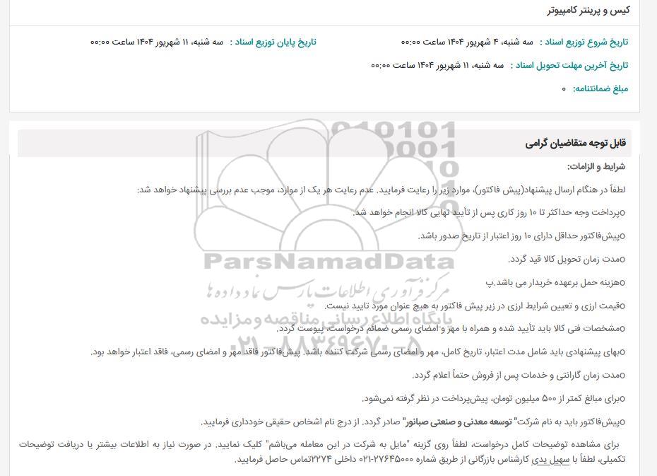 استعلام بها و موضوع استعلام استعلام کیس و پرینتر کامپیوتر به اطلاع کلیه شرکتها و افراد متخصص واجد شرایط میرساند، آگهی گذار در نظر دارد از طریق استعلام بها، نسبت به انتخاب و دریافت پیشنهادات اقدام نماید. این استعلام با کد آگهی ثبت شده در سامانه خبرگزاری پارس نماد : 9466561 منتشر شده است. مشخصات استعلام : تاریخ شروع استعلام: 1404/06/05 آخرین مهلت ارسال پیشنهاد قیمت : 1404/06/11 و محل اجرای پروژه : استان تهران میباشد. استعلام قیمت مورد درخواست : استعلام کیس و پرینتر کامپیوتر با دستهبندیهای تخصصی و گروه های مرتبط : کامپیوتر, ماشین اداری, استعلام اطلاع رسانی میگردد. شرایط شرکت در استعلام آنلاین : ابتدا ثبت نام در سامانه استعلام پارس نماد و تکمیل مدارک موردنیاز و بارگذاری در سامانه رعایت تمامی ضوابط و الزامات مندرج در اسناد استعلام است.