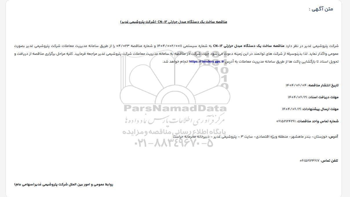 مناقصه ساخت یک دستگاه مبدل حرارتی CN-IF (شرکت پتروشیمی غدیر)