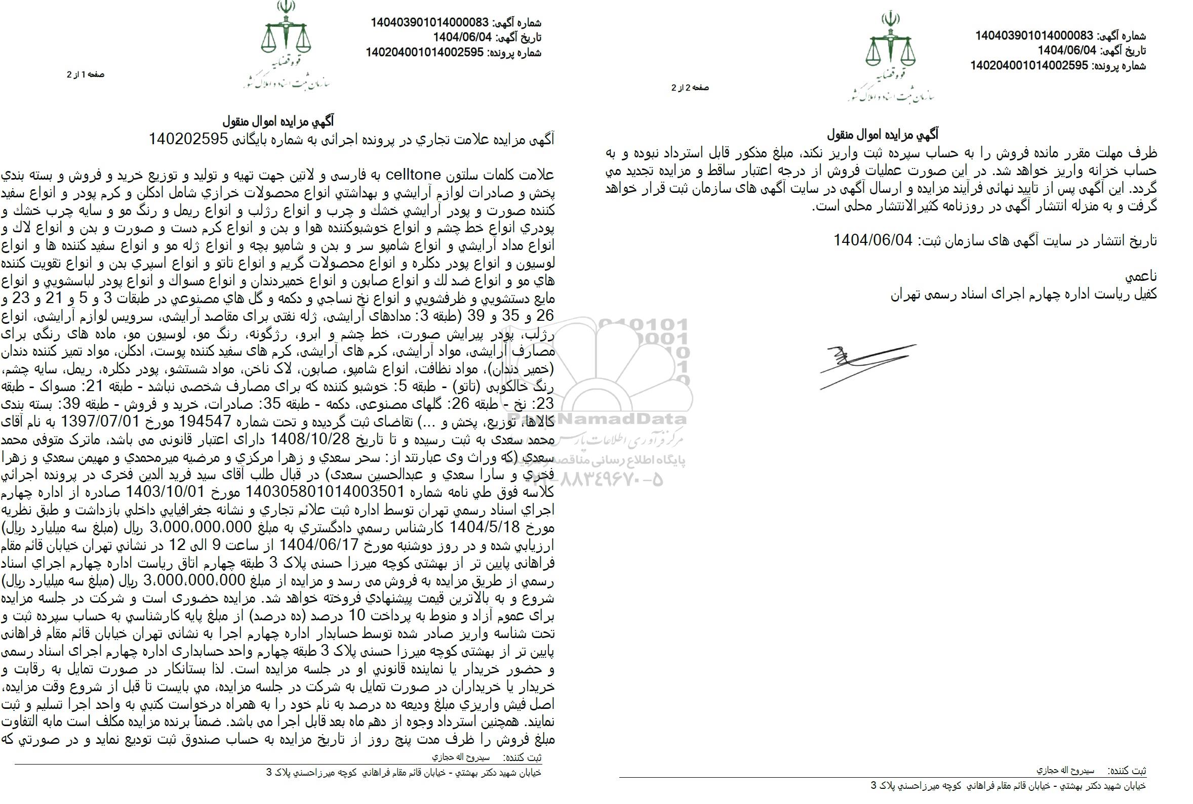مزایده فروش علامت تجاری علامت کلمات سلتون Celltone به فارسی و لاتین جهت تهیه و تولید و توزیع خرید و فروش و بسته بندی پخش و صادرات لوازم آرایشی...