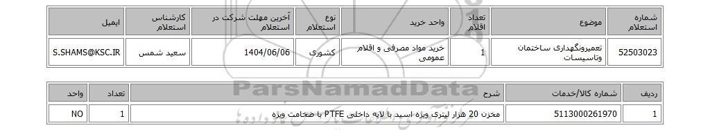 | 52503023 | تعمیرونگهداری ساختمان وتاسیسات | 1 | خرید مواد مصرفی و اقلام عمومی | کشوری | 1404/06/06 | سعید شمس | S.SHAMS@KSC.IR |