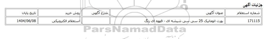 | 171115 | بورت اتوماتیک 25 سی سی شیشه ای - قهوه ای رنگ | استعلام الکترونیکی | 1404/06/08 |