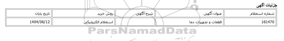 | 161470 | قطعات و تجهیزات دما | استعلام الکترونیکی | 1404/06/12 |