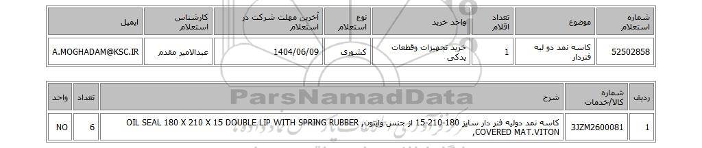 | 52502858 | کاسه نمد دو لبه فنردار | 1 | خرید تجهیزات وقطعات یدکی | کشوری | 1404/06/09 | عبدالامیر مقدم | A.MOGHADAM@KSC.IR |