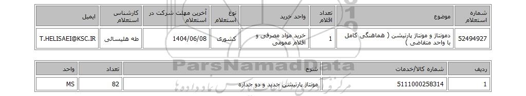 | 52494927 | دمونتاژ و مونتاژ پارتیشن ( هماهنگی کامل با واحد متقاضی ) | 1 | خرید مواد مصرفی و اقلام عمومی | کشوری | 1404/06/08 | طه هلیسائی | T.HELISAEI@KSC.IR |
