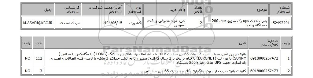 | 52493201 | باتری جهت ups رک سویچ های 200 دستگاه و احیا | 2 | خرید مواد مصرفی و اقلام عمومی | کشوری | 1404/06/15 | مزدک اسدی | M.ASADI@KSC.IR |