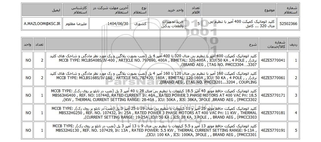 52502366 کلید اتوماتیک کمپکت 400 آمپر با تنظیم بی متال 320 ... کامل5خرید تجهیزات وقطعات یدکیکشوری1404/06/30علیرضا مظلومA.MAZLOOM@KSC.IR