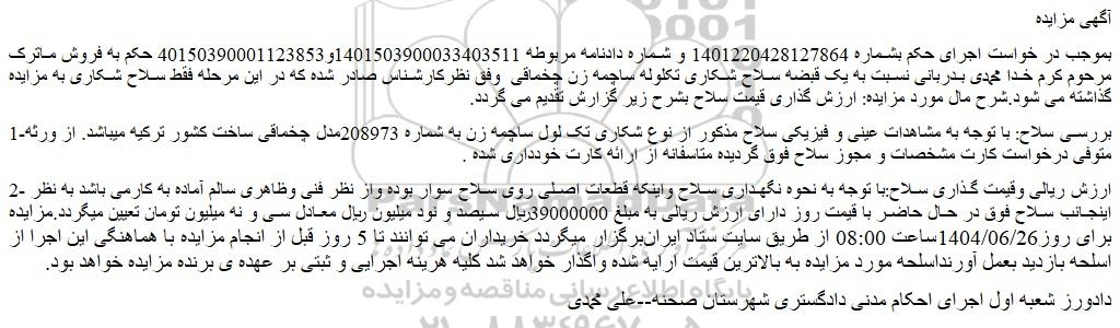 بموجب در خواست اجرای حکم بشماره 1401220428127864 و شماره دادنامه مربوطه 1401503900033403511و40150390001123853 حکم به فروش ماترک مرحوم کرم خدا محمدی بدربانی نسبت به یک قبضه سلاح شکاری تکلوله ساچمه زن چخماقی  وفق نظرکارشناس صادر شده که در این مرحله فقط سلاح شکاری به مزایده گذاشته می شود.شرح مال مورد مزایده: ارزش گذاری قیمت سلاح بشرح زیر گزارش تقدیم می گردد.
