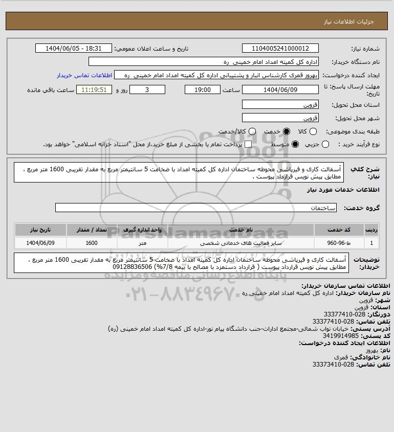 شرح کلی نیاز: آسفالت کاری و قیرپاشی محوطه ساختمان اداره کل کمیته امداد با ضخامت 5 سانتیمتر مربع به مقدار تقریبی 1600 متر مربع ، مطابق پیش نویس قرارداد پیوست .