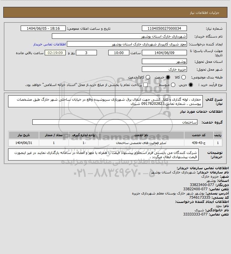 شرح کلی نیاز: حفاری ، لوله گذاری و کابل کشی جهت انتقال برق شهربازی سرپوشیده واقع در خیابان ساحلی شهر خارگ طبق مشخصات پیوستی . شماره تماس 09178202823 شیری