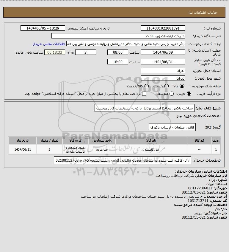 اسناد مناقصه استعلام ساخت باکس محافظ استند پرتابل با توجه مشخصات فایل پیوست به علت اتمام مهلت شرکت در مناقصه از روی وب سایت برداشته شده است. برای رویت اسناد جدید به صفحه اسناد مناقصه مزایده مراجعه کنید.