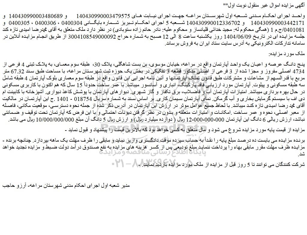 واحد اجرای احکام مدنی شعبه اول شهرستان مراغه جهت اجرای نیابت های 140430990003479575  و 140430990003480689 و 140430990003442171 و 140430990012336702 شعبه 5 اجرای احکام تبریز شماره بایگانی 0400304، 0400306، 0400305 و 0401081/ج.م 1 (همگی محکوم له: مجید خدائی قلیانساز و محکوم علیه: نادر حاتم زاده ستوبادی) در نظر دارد ملک متعلق به آقای محمدرضا امیدی تازه کند جلسه مزایده ای در تاریخ 1404/06/09 روز یکشنبه ساعت 8 الی 12 صبح به شماره حراج 3004108549000092 از طریق انجام مزایده آنلاین در سامانه تدارکات الکترونیکی به آدرس سایت ستاد ایران به فروش برساند.