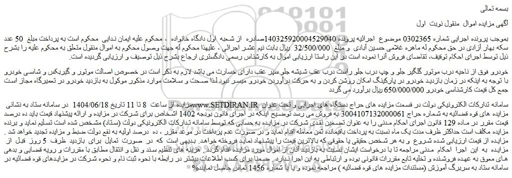 بموجب پرونده اجرایی شماره 0302365 موضوع  اجرائیه پرونده 140325920004529040صادره  از شعبه  اول دادگاه خانواده  ، محکوم علیه ایمان ندایی  محکوم است به پرداخت مبلغ  50 عدد سکه بهار آزادی در حق محکوم له ماهره غلامی حسین آبادی  و مبلغ  32/500/000  ریال بابت نیم عشر اجرائی ، علیهذا محکوم له جهت وصول محکوم به اموال منقول متعلق به محکوم علیه را بشرح ذیل توسط اجرای احکام توقیف، تقاضای فروش آنرا نموده است در این راستا ارزیابی اموال به کارشناس رسمی دادگستری ارجاع بشرح ذیل توصیف و ارزیابی گردیده است.