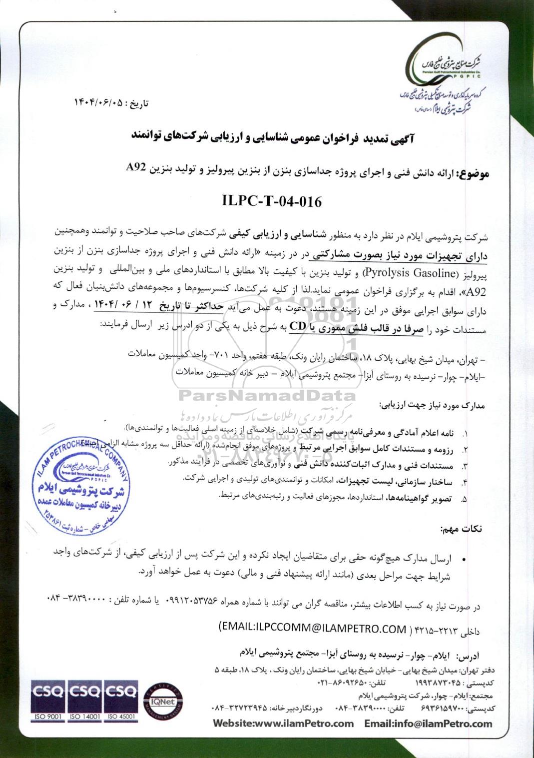 شرکت پتروشیمی ایلام در نظر دارد به منظور شناسایی و ارزیابی کیفی شرکتهای صاحب صلاحیت و توانمند وهمچنین دارای تجهیزات مورد نیاز بصورت مشارکتی در در زمینه «ارائه دانش فنی و اجرای پروژه جداسازی بنزن از بنزین پیرولیز (Pyrolysis Gasoline) و تولید بنزین با کیفیت بالا مطابق با استانداردهای ملی و بینالمللی و تولید بنزین A92»، اقدام به برگزاری فراخوان عمومی نماید. لذا از کلیه شرکتها، کنسرسیومها و مجموعههای دانشبنیان فعال که دارای سوابق اجرایی موفق در این زمینه هستند، دعوت به عمل میآید حداکثر تا تاریخ 1404.06.12، مدارک و مستندات خود را صرفا در قالب فلش مموری یا CD به شرح ذیل به یکی از دو ادرس زیر ارسال فرمایند: