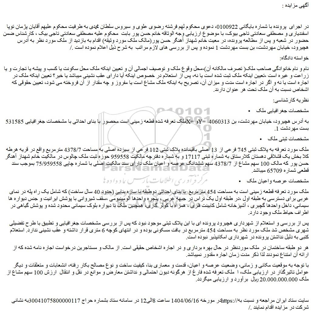 در اجرای پرونده با شماره بایگانی 0100922، دعوی محکوم لهم فرشته رضوی علوی و سیروس سلطان محمدی به طرفیت محکوم علیهم آقایان پژمان توپا اسفندیاری و مصطفی سعادتی تاجی بیوک، با موضوع ارزیابی وجه الوثاقه خانم حسن پور بابت محکوم علیه مصطفی سعادتی تاجی بیک ، کارشناس ضمن حضور در شعبه و پس از مطالعه پرونده، در معیت خانم شهناز آهنگر حسن پور(مالک ملک مورد وثیقه) اقدام به بازدید از ملک مورد نظر به آدرس هچیرود، خیابان مهردشت، بن بست مهردشت 1 نموده و پس از بررسی های لازم مراتب به شرح ذیل اعلام نموده است ./