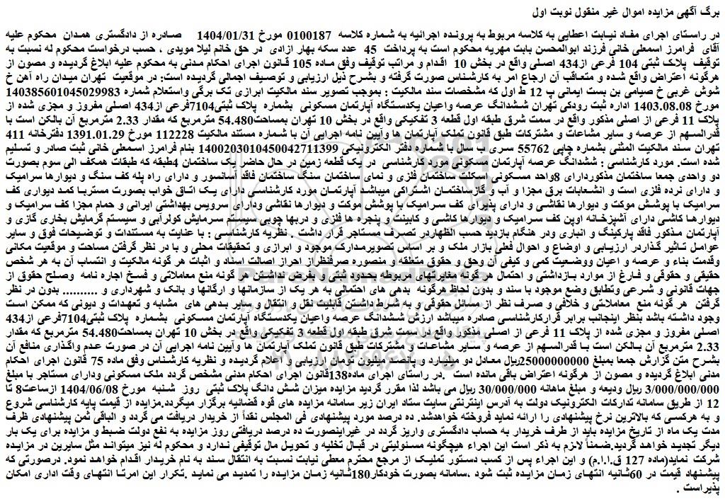 در راستای اجرای مفاد نیابت اعطایی به کلاسه مربوط به پرونده اجرائیه به شماره کلاسه 0100187 مورخ 1404/01/31 صادره از دادگستری همدان محکوم علیه آقای فرامرز اسمعلی خانی فرزند ابوالمحسن بابت مهریه محکوم است به پرداخت 45 عدد سکه بهار ازادی در حق خانم لیلا مویدی ، حسب درخواست محکوم له نسبت به توقیف پلاک ثبتی 104 فرعی از434 اصلی واقع در بخش 10 اقدام و مراتب توقیف وفق ماده 105 قانون اجرای احکام مدنی به محکوم علیه ابلاغ گردیده و مصون از هرگونه اعتراض واقع شده و متعاقب آن ارجاع امر به کارشناس صورت گرفته و بشرح ذیل ارزیابی و توصیف اجمالی گردیده است: در موقعیت تهران میدان راه آهن خ شوش غربی خ صیامی بن بست ایمانی پ 12 ط اول که مشخصات سند مالکیت : بموجب تصویر سند مالکیت ابرازی تک برگی واستعلام شماره 140385601045029983 مورخ 1403.08.08 اداره ثبت رودکی تهران ششدانگ عرصه واعیان یکدستگاه آپارتمان مسکونی بشماره پلاک ثبتی7104فرعی از434 اصلی مفروز و مجزی شده از پلاک 11 فرعی از اصلی مذکور واقع در سمت شرق طبقه اول قطعه 3 تفکیکی واقع در بخش 10 تهران بمساحت54.480 مترمربع که مقدار 2.33 مترمربع آن بالکن است با قدرالسهم از عرصه و سایر مشاعات و مشترکات طبق قانون تملک آپارتمان ها وآیین نامه اجرایی آن با شماره مستند مالکیت 112228 مورخ 1391.01.29 دفترخانه 411 تهران سند مالکیت المثنی بشماره چاپی 55762 سری ب سال با شماره دفتر الکترونیکی 1400203010450042711399 بنام فرامرز اسمعلی خانی ثبت صادر و تسلیم شده است. مورد کارشناسی : ششدانگ عرصه آپارتمان مسکونی مورد کارشناسی در یک قطعه زمین در حال حاضر یک ساختمان 4طبقه که طبقات همکف الی سوم بصورت دو واحدی جمعا ساختمان مذکوردارای 8واحد مسکونی اسکلت ساختمان فلزی و نمای ساختمان سنگ ساختمان فاقد آسانسور و دارای راه پله کف سنگ و دیوارها سرامیک و دارای نرده فلزی است و انشعابات برق مجزا و آب و گازساختمان اشتراکی میباشد آپارتمان مورد کارشناسی دارای یک اتاق خواب بصورت مستربا کمد دیواری کف سرامیک با پوشش موکت و دیوارها نقاشی و دارای پذیرای کف سرامیک با پوشش موکت و دیوارها نقاشی ودارای سرویس بهداشتی ایرانی و حمام مجزا کف سرامیک و دیوارها کاشی دارای آشپزخانه اوپن کف سرامیک و دیوارها کاشی و کابینت و پنجره ها فلزی و دربها چوبی سیستم سرمایش کولرآبی و سیستم گرمایش بخاری گازی و آپارتمان مذکور فاقد پارکینگ و انباری ودر هنگام بازدید حسب الظهاردر تصرف مستاجر قرار داشت . نظریه کارشناسی : با عنایت به مستندات و توضیحات فوق و سایر عوامل تاثیر گذاردر ارزیابی و اوضاع و احوال فعلی بازار ملک و بر اساس تصویرمدارک موجود و ابرازی و تحقیقات محلی و با در نظر گرفتن مساحت و موقعیت مکانی وقدمت بناء و عرصه و اعیان ووضعیت کمی و کیفی آن وحق و حقوق متعلقه و منصوره صرفنظراز احراز اصالت اسناد و اثبات هر گونه مالکیت و انتساب آن به هر شخص حقیقی و حقوقی و فارغ از موارد بازداشتی و احتمال هر گونه مغایرتهای مربوطه بحدود ثبتی و بفرض نداشتن هر گونه منع معاملاتی و فسخ اجاره نامه وصلح حقوق از جهات قانونی و شرعی وتطابق وضع موجود با سند و بدون لحاظ هرگونه بدهی های احتمالی به هر یک از سازمانها و ارگانها و بانک و شهرداری و .......... بدون در نظر گرفتن هر گونه منع معاملاتی و خلافی و صرف نظر از مسائل حقوقی و به شرط داشتن قابلیت نقل و انتقال و سایر بدهی های مشابه و تعهدات و دیونی که ممکن است وجود داشته باشد بنظر اینجانب برابر قرارکارشناسی صادره میباشد ارزش ششدانگ عرصه واعیان یکدستگاه آپارتمان مسکونی بشماره پلاک ثبتی7104فرعی از434 اصلی مفروز و مجزی شده از پلاک 11 فرعی از اصلی مذکور واقع در سمت شرق طبقه اول قطعه 3 تفکیکی واقع در بخش 10 تهران بمساحت54.480 مترمربع که مقدار 2.33 مترمربع آن بالکن است با قدرالسهم از عرصه و سایر مشاعات و مشترکات طبق قانون تملک آپارتمان ها وآیین نامه اجرایی آن در صورت عدم واگذاری منافع آن بشرح متن گزارش جمعا بمبلغ 25000000000ریال معادل دو میلیارد و پانصد میلیون تومان ارزیابی و اعلام 