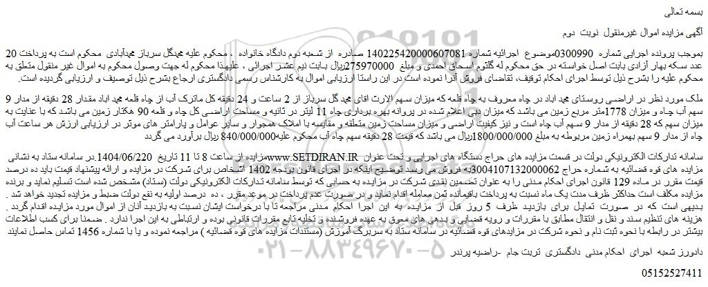 مزایده از ساعت 8 تا 11 تاریخ 1404/06/220.در سامانه ستاد به نشانی سایت ستاد ایران سامانه تدارکات الکترونیکی دولت در قسمت مزایده های حراج دستگاه های اجرایی و تحت عنوان مزایده های قوه قضائیه به شماره حراج 3004107132000062به فروش می رسد توضیح اینکه در اجرای قانون بودجه 1402 اشخاص برای شرکت در مزایده و ارائه پیشنهاد قیمت باید ده درصد قیمت مقرر در ماده 129 قانون اجرای احکام مدنی را به عنوان تضمین نقدی شرکت در مزایده به حسابی که توسط سامانه تدارکات الکترونیکی دولت (ستاد) مشخص شده است تسلیم نماید و برنده مزایده مکلف است حداکثر ظرف مدت یک ماه نسبت به پرداخت باقیمانده ثمن معامله اقدام نماید و در صورت عدم پرداخت در موعد مقرر ، ده درصد اولیه به نفع دولت ضبط و مزایده تجدید خواهد شد . بدیهی است که در صورت تمایل برای بازدید ظرف 5 روز قبل از مزایده به این اجرا احکام مدنی مراجعه تا با درخواست ایشان نسبت به بازدید آنان از اموال مورد مزایده اقدام گردد . هزینه های تنظیم سند و نقل و انتقال مطابق با مقررات و رویه قضایی و بدهی های معوق به عهده فروشنده و تخلیه تابع مقررات قانونی بوده و ارتباطی به این اجرا ندارد . ضمنا برای کسب اطلاعات بیشتر در رابطه با نحوه ثبت نام و نحوه شرکت در مزایدهای قوه قضائیه در سامانه ستاد به سربرگ آموزش (مستندات مزایده های قوه قضائیه ) مراجعه نموده و یا با شماره 1456 تماس حاصل نمایند