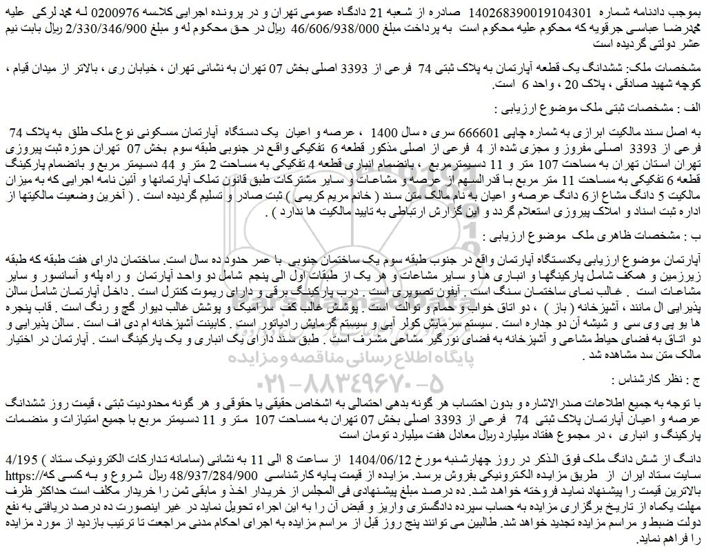 مزایده عرصه و اعیان  یک دستگاه  آپارتمان مسکونی نوع ملک طلق  به پلاک 74  فرعی از 3393  اصلی, مزایده عرصه و اعیان  یک دستگاه  آپارتمان مسکونی نوع ملک طلق  به پلاک 74  فرعی از 3393  اصلی