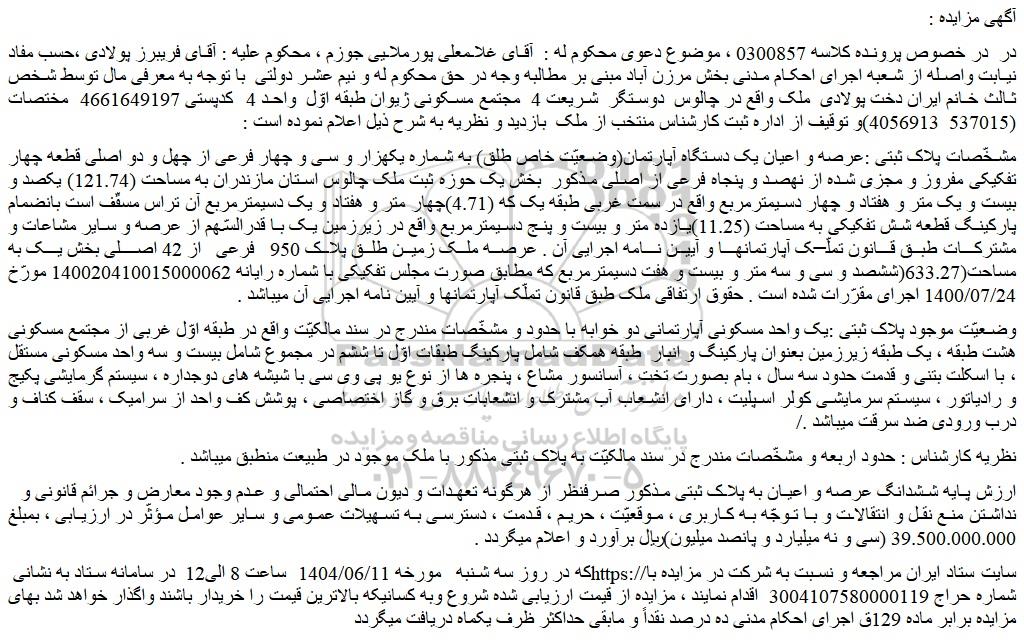 مزایده عمومی مزایده عرصه و اعیان یک دستگاه آپارتمان(وضعیّت خاص طلق) به شماره یکهزار و سی و چهار فرعی از چهل و دو اصلی قطعه چهار تفکیکی مفروز و مجزی شده از نهصد و پنجاه فرعی از اصلی برگزار میگردد. از کلیه افراد متخصص و شرکتهای واجد شرایط دعوت به عمل میآید تا در این مزایده با کد خبرگزاری پارس نماد : 9467545 شرکت نمایند تاریخ شروع مزایده : 1404/05/28 مهلت شرکت در مزایده: تا پایان روز 1404/06/11
