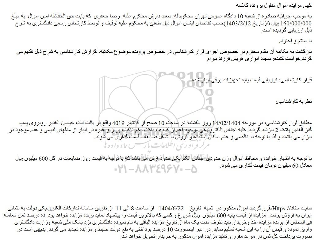به موجب اجرائیه صادره از شعبه 10 دادگاه عمومی تهران محکوم له: سعید دارش محکوم علیه: رضا جعفری که بابت حق الحفاظه امین اموال به مبلغ 160/000/000 ریال (ازتاریخ 1403/2/12)حسب تقاضای ایشان اموال ذیل متعلق به محکوم علیه توقیف و توسط کارشناس رسمی دادگستری به شرح ذیل ارزیابی گردیده است.