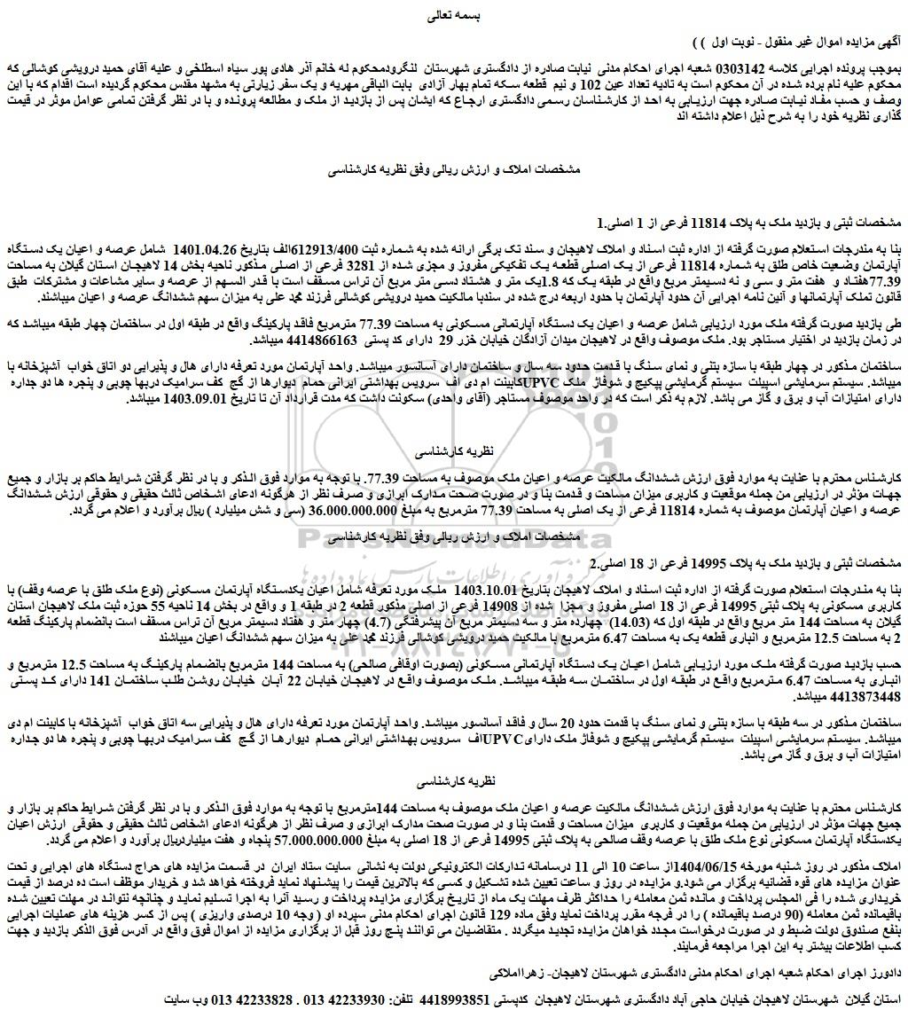 بنا به مندرجات استعلام صورت گرفته از اداره ثبت اسناد و املاک لاهیجان و سند تک برگی ارائه شده به شماره ثبت 612913/400الف بتاریخ 1401.04.26 شامل عرصه و اعیان یک دستگاه آپارتمان وضعیت خاص طلق به شماره 11814 فرعی از یک اصلی قطعه یک تفکیکی مفروز و مجزی شده از 3281 فرعی از اصلی مذکور ناحیه بخش 14 لاهیجان استان گیلان به مساحت 77.39هفتاد و هفت متر و سی و نه دسیمتر مربع واقع در طبقه یک که 1.8یک متر و هشتاد دسی متر مربع آن تراس مسقف است با قدر السهم از عرصه و سایر مشاعات و مشترکات طبق قانون تملک آپارتمانها و آئین نامه اجرایی آن حدود آپارتمان با حدود اربعه درج شده در سندبا مالکیت حمید درویشی کوشالی فرزند محمد علی به میزان سهم ششدانگ عرصه و اعیان میباشند.