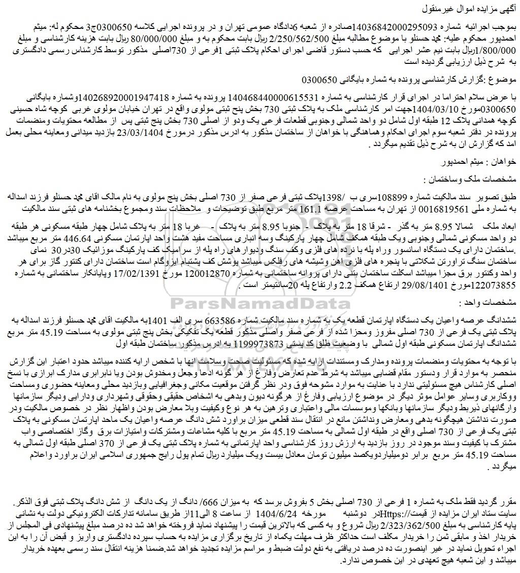 ششدانگ عرصه واعیان یک دستگاه اپارتمان قطعه یک به شماره سند مالکیت شماره 663586 سری الف 1401به مالکیت اقای محمد حسنلو فرزند اسداله به پلاک ثبتی یک فرعی از 730 اصلی مفروز ومحزا شده از فرعی صفر واصلی مذکور قطعه یک تفکیکی بخش پنج ثبتی مولوی به مساحت 45.19 متر مربع ششدانگ اپارتمان مسکونی طبقه اول شمالی با وضعیت طلق کد پستی 1199973873 به ادرس مذکور ساختمان طبقه اول