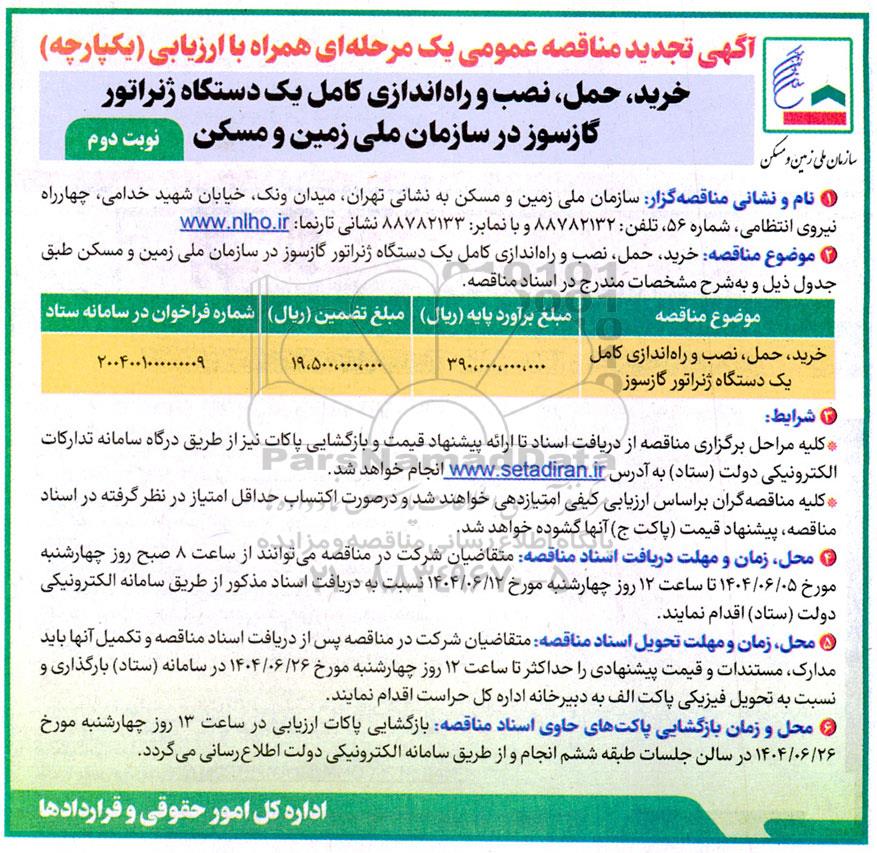 خرید، حمل، نصب و راه اندازی کامل یک دستگاه ژنراتور گازسوز در سازمان ملی زمین و مسکن