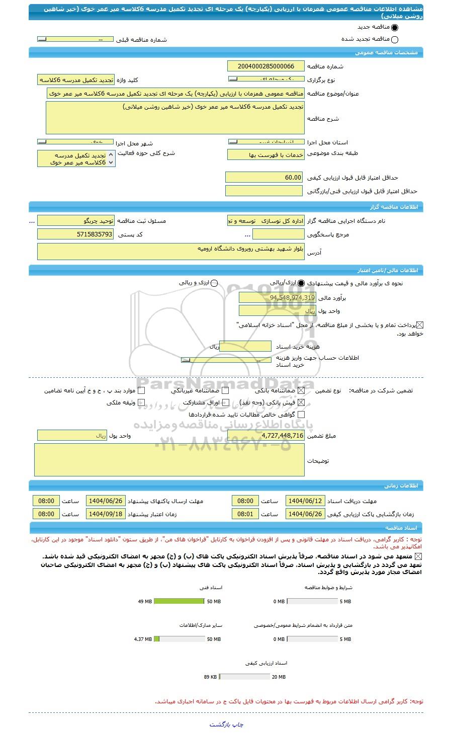 علاقهمندان میتوانند جهت دریافت اسناد و اطلاعات تکمیلی، مناقصه مناقصه عمومی همزمان با ارزیابی (یکپارچه) یک مرحله ای تجدید تکمیل مدرسه 6کلاسه میر عمر خوی (خیر شاهین روشن میلانی) با سامانه مناقصات و مزایدات ایران پارسنماد داده ها 88349670 تماس حاصل نمایند.