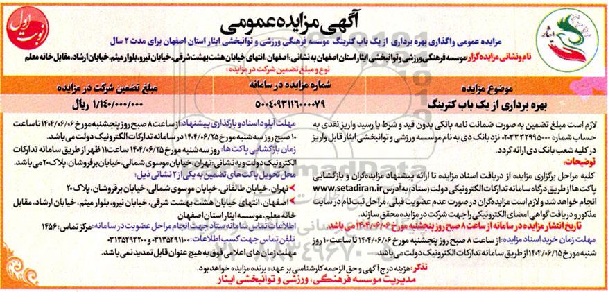 مزایده عمومی واگذاری بهره برداری از یک باب کترینگ موسسه فرهنگی ورزشی و توانبخشی ایثار استان اصفهان برای مدت دو سال