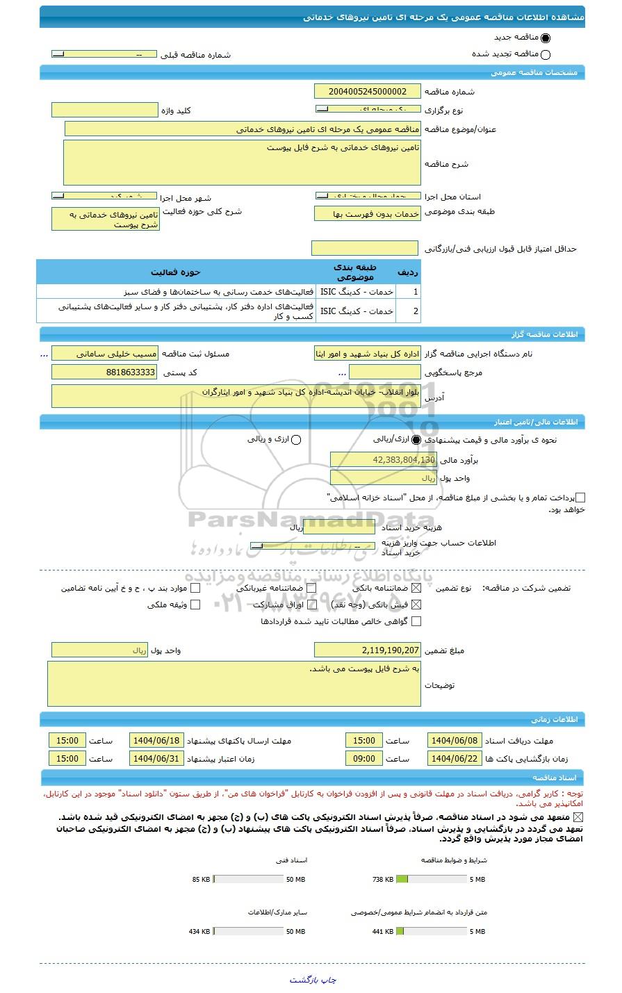 نام دستگاه اجرایی مناقصه گزاراداره کل بنیاد شهید و امور ایثارگران استان چهارمحال و بختیاریمسئول ثبت مناقصهمسیب خلیلی سامانی