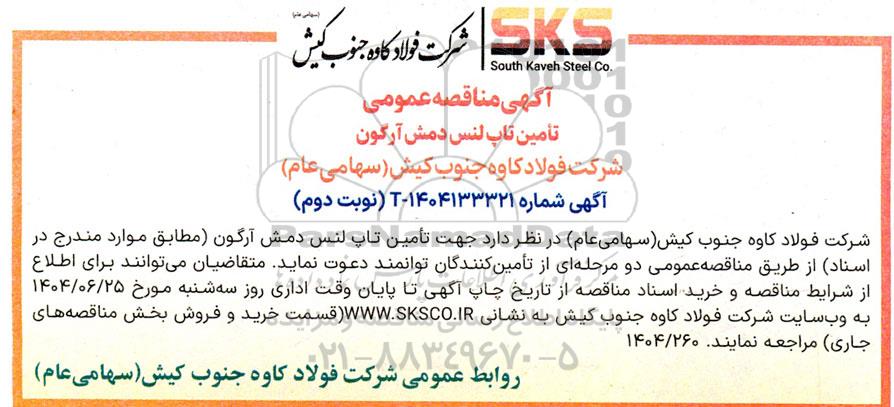 شرکت فولاد کاوه جنوب کیش (سهامی عام) در نظر دارد جهت تامین تاپ لنس دمش آرگون (مطابق موارد مندرج در اسناد) از طریق مناقصه عمومی دو مرحله ای از تأمین کنندگان واجد شرایط و توانمند دعوت نماید. متقاضیان می توانند برای اطلاع از شرایط مناقصه و خرید اسناد مناقصه از تاریخ چاپ آگهی تا پایان وقت اداری روز سه شنبه مورخ 1404.06.25 به وب سایت شرکت فولاد کاوه جنوب کیش به نشانی WWW.SKSCO.IR (قسمت خرید و فروش بخش مناقصه های جاری) مراجعه نمایند. 1404/260