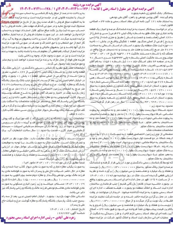 مزایده فروش ششدانگ عرصه و اعیان یک قطعه واحد تجاری نوع ملک طلق به شماره پلاک ثبتی 36 فرعی (سی و شش) از 866 اصلی (هشتصد و شصت و شش) مفروز و مجزی شده از 35 ، واقع در بخش 01 ناحیه 00 حوزه ثبت ملک منطقه یک بجنورد استان خراسان شمالی به مساحت 67.29 متر مربع
