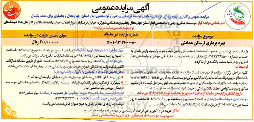 مزایده عمومی واگذاری بهره برداری از سالن همایش موسسه فرهنگی ورزشی و توانبخشی ایثار استان چهارمحال و بختیاری برای مدت یکسال