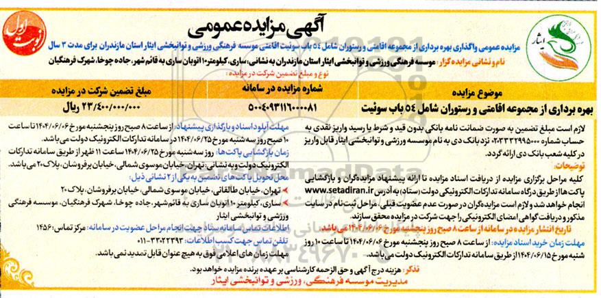 مزایده عمومی واگذاری بهره برداری از مجموعه اقامتی و رستوران شامل 54 باب سوئیت اقامتی موسسه فرهنگی ورزشی و توانبخشی ایثار استان مازندران برای مدت 3 سال