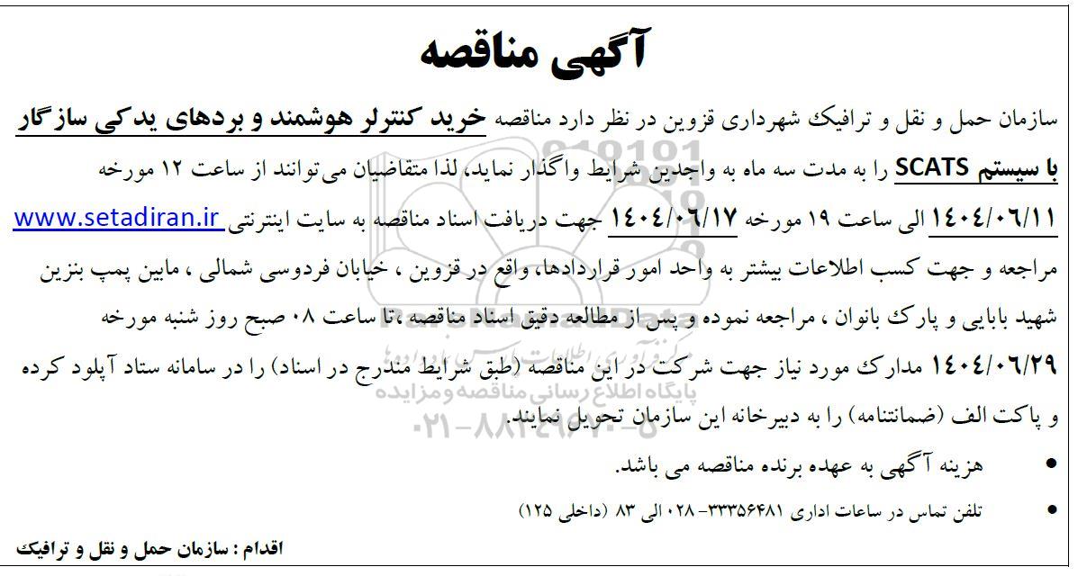 سازمان حمل و نقل و ترافیک شهرداری قزوین در نظر دارد مناقصه خرید کنترلر هوشمند و بردهای یدکی سازگار با سیستم SCATS را به مدت سه ماه به واجدین شرایط واگذار نماید لذا متقاضیان میتوانند از ساعت 12 مورخه