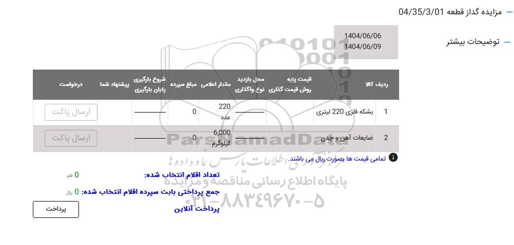 9 مزایده عمومی فروش 200 تن آهن ضایعاتی 9698367 1404/07/22 new not special not payed ایلام