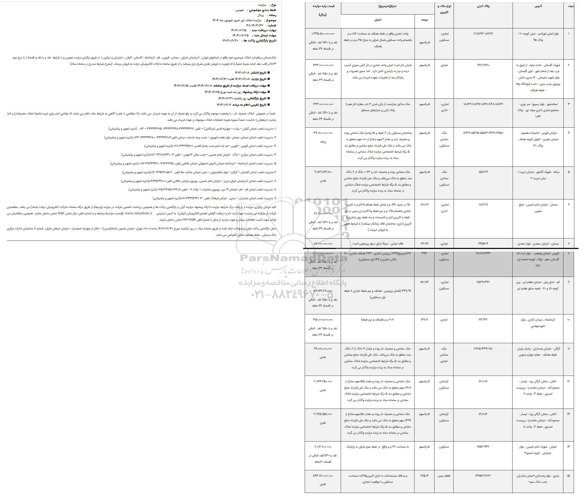 مزایده عمومی مزایده فروش املاک غیرضرور برگزار میگردد. از کلیه افراد متخصص و شرکت‌های واجد شرایط دعوت به عمل می‌آید تا در این مزایده با کد خبرگزاری پارس نماد : 9469344 شرکت نمایند تاریخ شروع مزایده : 1404/06/06 مهلت شرکت در مزایده: تا پایان روز 1404/06/15 مکان برگزاری اموال واگذاری استان‌های تهران , مرکزی, مازندران, گلستان, گیلان, کرمانشاه, قزوین, قم, سمنان, آذربایجان شرقی و دسته‌بندی‌های مربوط به این حراجی املاک و زمین میباشد. اطلاعات دقیق‌تر درباره شرایط شرکت در مزایده آنلاین و نحوه ارسال مدارک، الزامات پروژه و دریافت اسناد مزایده و تاریخ بازگشایی پاکت‌ها، در بخش اطلاعات تکمیلی این آگهی درج شده است.
