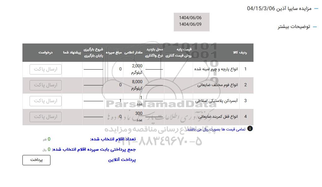4 مزایده اقلام ضایعاتی شرکت های ... 9696680 1404/07/22 new not special not payed تهران