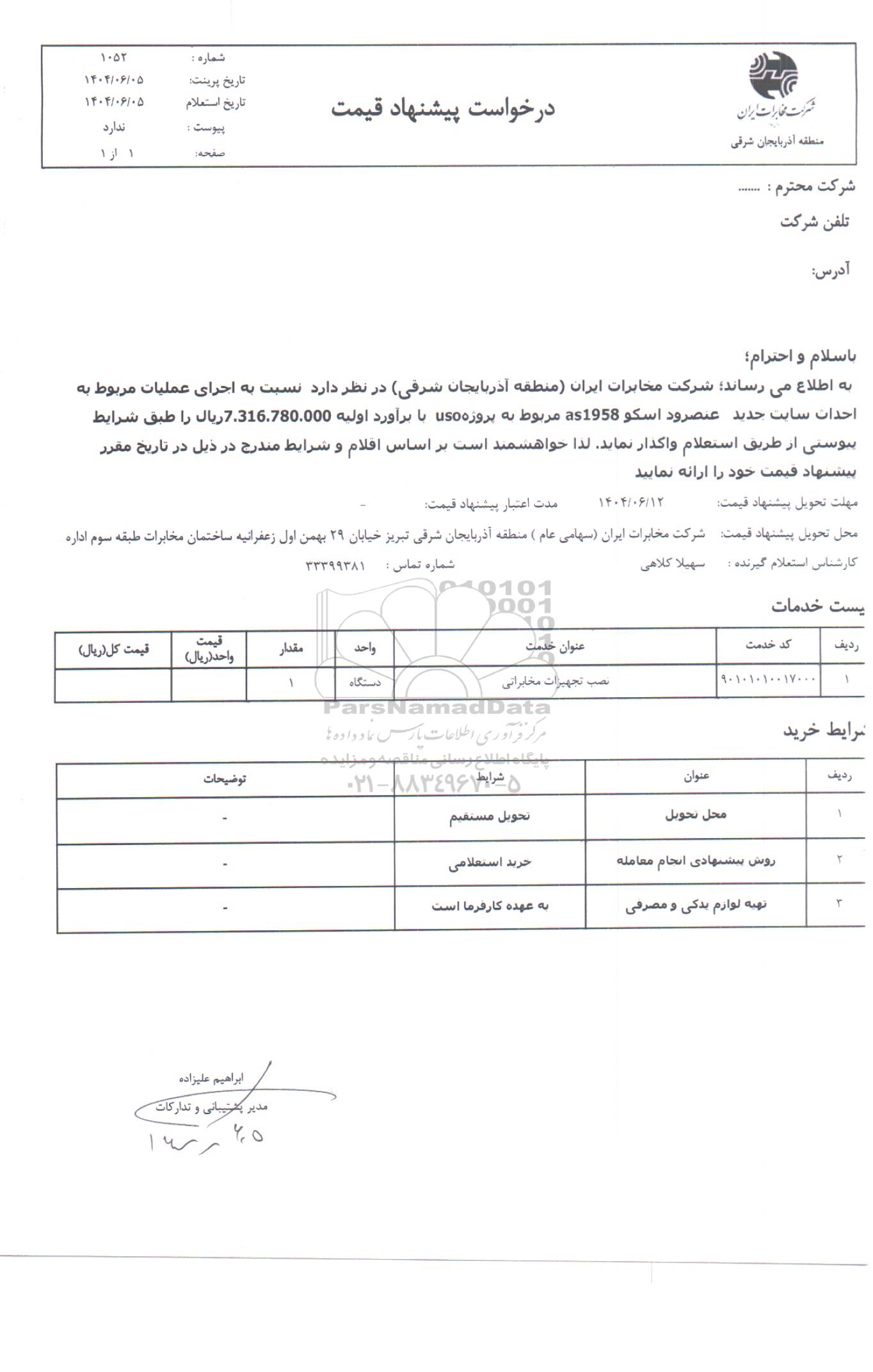 به اطلاع میرساند شرکت مخابرات ایران منطقه آذربایجان شرقی در نظر دارد نسبت به اجرای عملیات مربوط به احداث سایت جدید عنصرود اسکو as1958 مربوط به پروژه uso با برآورد اولیه 7.316.780.000 ریال را طبق شرایط پیوستی از طریق استعلام واکدار نماید. لذا خواهشمند است بر اساس اقلام و شرایط مندرج در ذیل در تاریخ مقرر