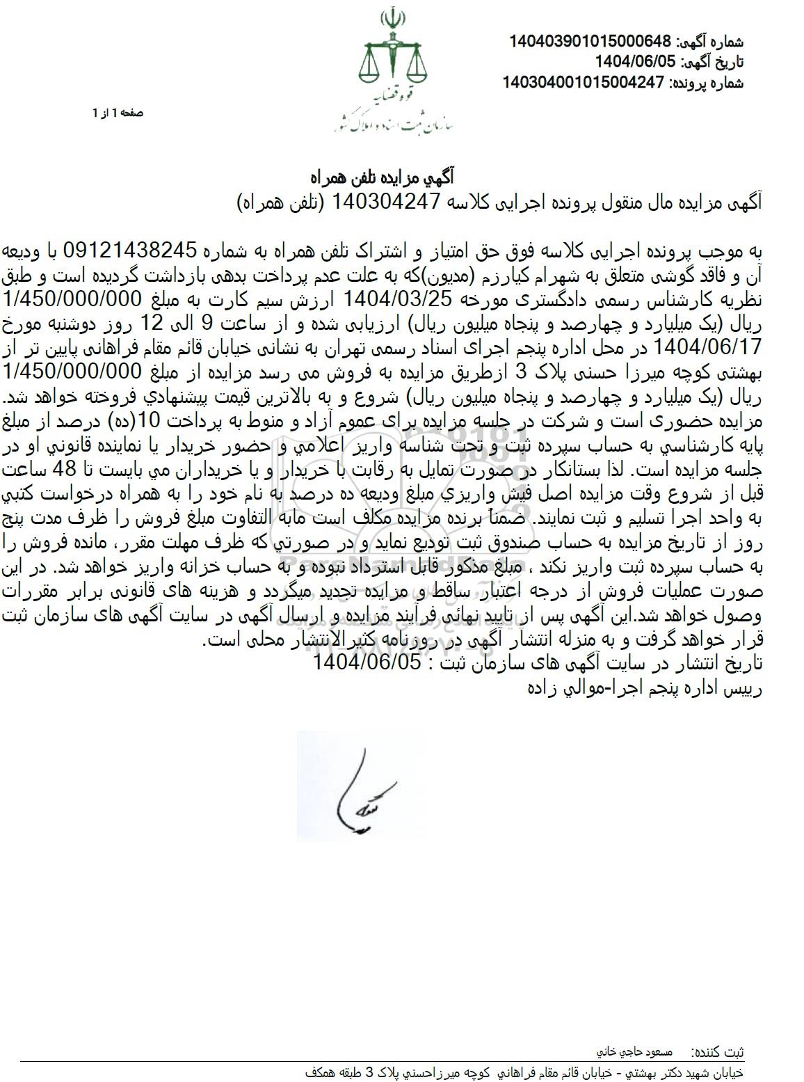 موضوع مزایده : حق امتیاز و اشتراک تلفن همراه به شماره 09121438245 به ارزش 1.450.000.000 ریال