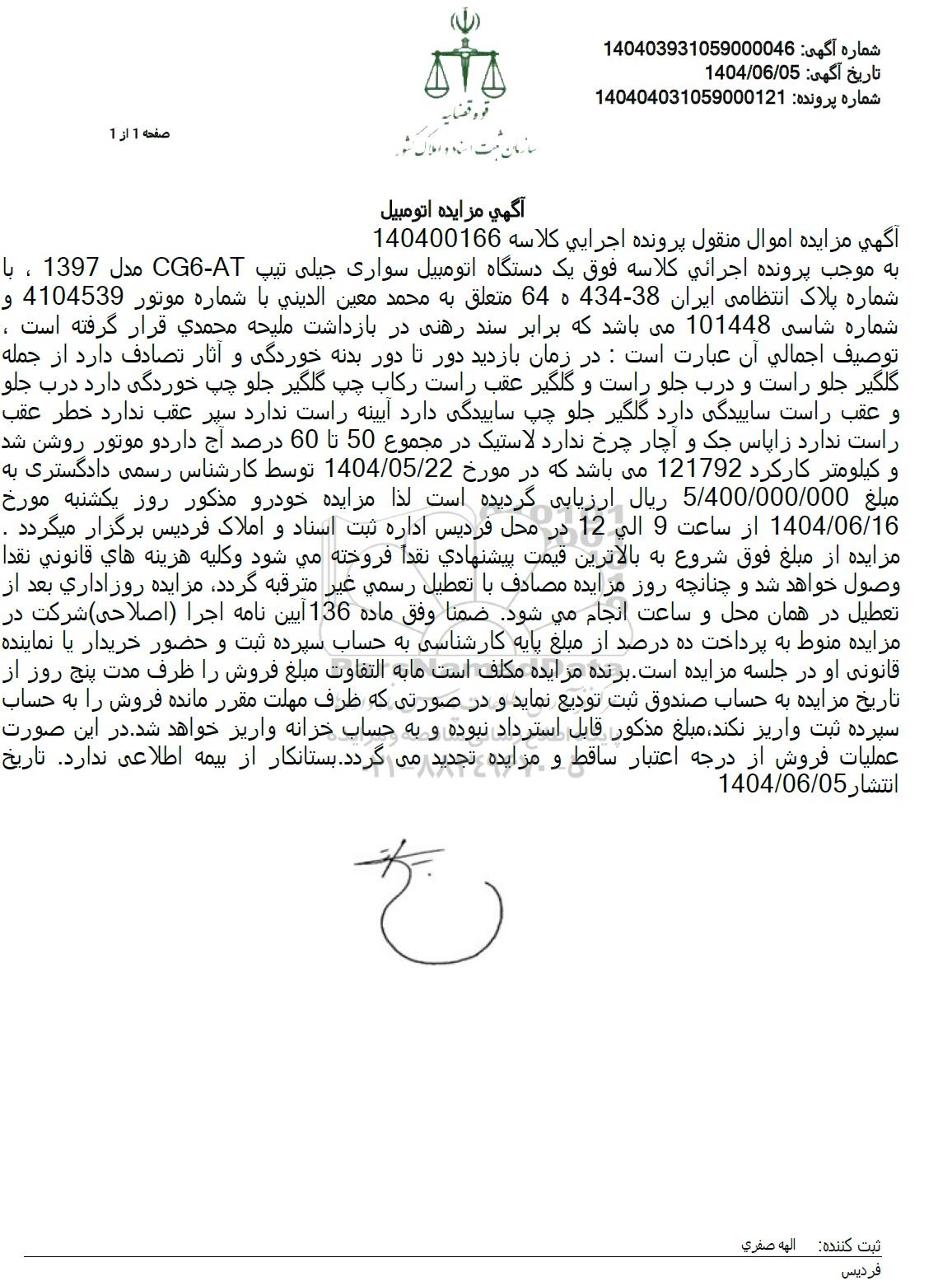 مزایده فروش یک دستگاه اتومبیل سواری جیلی تیپ CG6-AT مدل 1397
