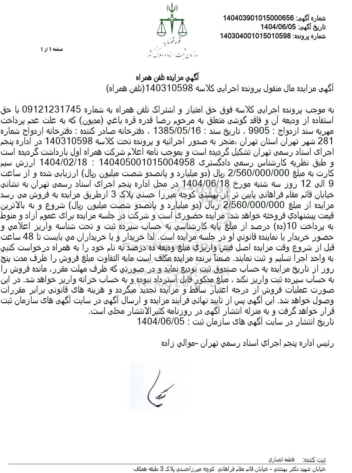 موضوع مزایده : حق امتیاز و اشتراک تلفن همراه به شماره 09121231745 به ارزش 2.560.000.000 ریال