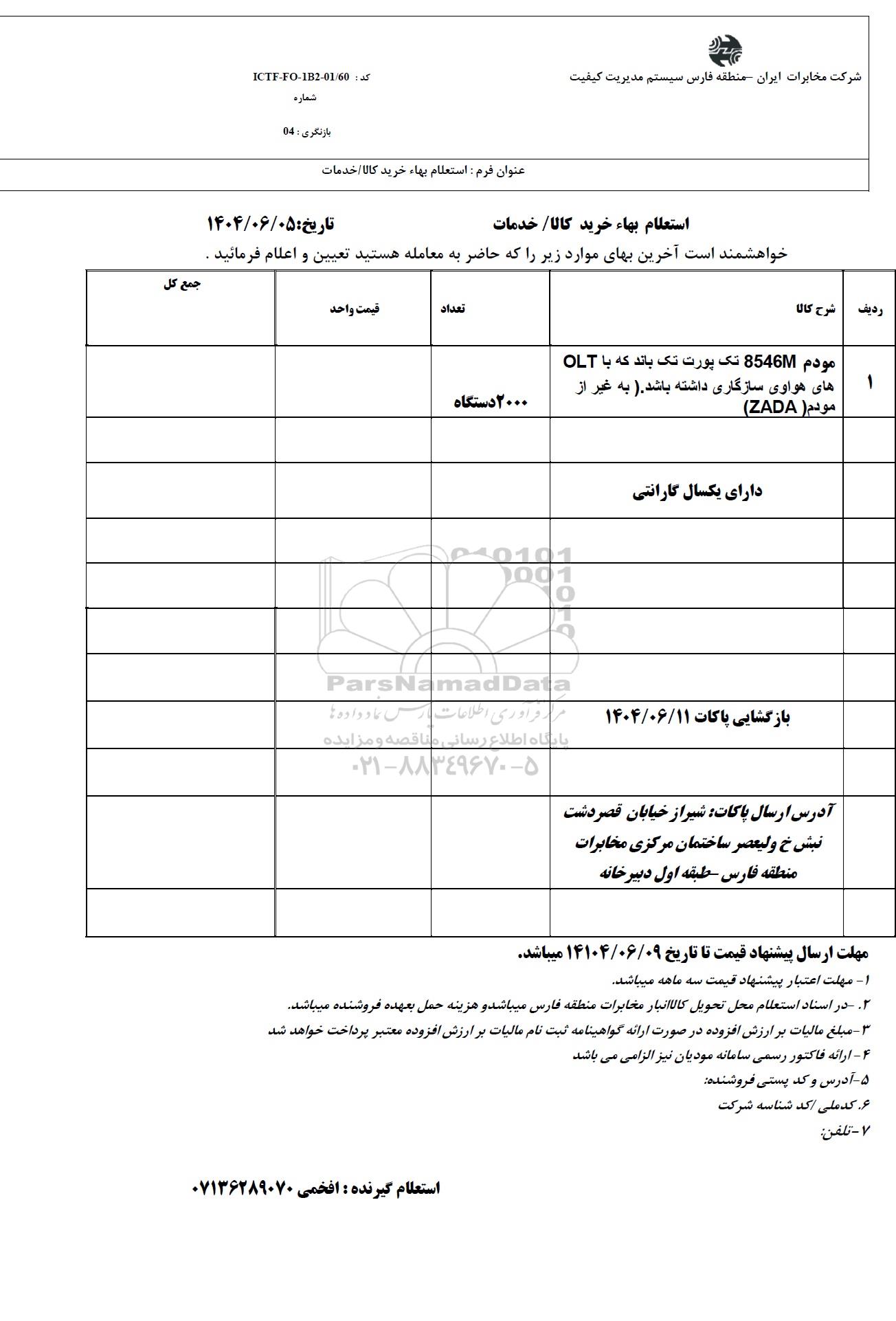 استعلام بها و موضوع استعلام استعلام مودم 8546M تک پورت تک باند که با OLT های هواوی به اطلاع کلیه شرکتها و افراد متخصص واجد شرایط میرساند، آگهی گذار در نظر دارد از طریق استعلام بها، نسبت به انتخاب و دریافت پیشنهادات اقدام نماید. این استعلام با کد آگهی ثبت شده در سامانه خبرگزاری پارس نماد : 9469376 منتشر شده است. مشخصات استعلام : تاریخ شروع استعلام: 1404/06/06 آخرین مهلت ارسال پیشنهاد قیمت : 1404/06/09 و محل اجرای پروژه : استان فارس میباشد. استعلام قیمت مورد درخواست : استعلام مودم 8546M تک پورت تک باند که با OLT های هواوی با دستهبندیهای تخصصی و گروه های مرتبط : کامپیوتر, اینترنت شبکه, تجهیزات مخابرات, استعلام اطلاع رسانی میگردد. شرایط شرکت در استعلام آنلاین : ابتدا ثبت نام در سامانه استعلام پارس نماد و تکمیل مدارک موردنیاز و بارگذاری در سامانه رعایت تمامی ضوابط و الزامات مندرج در اسناد استعلام است.