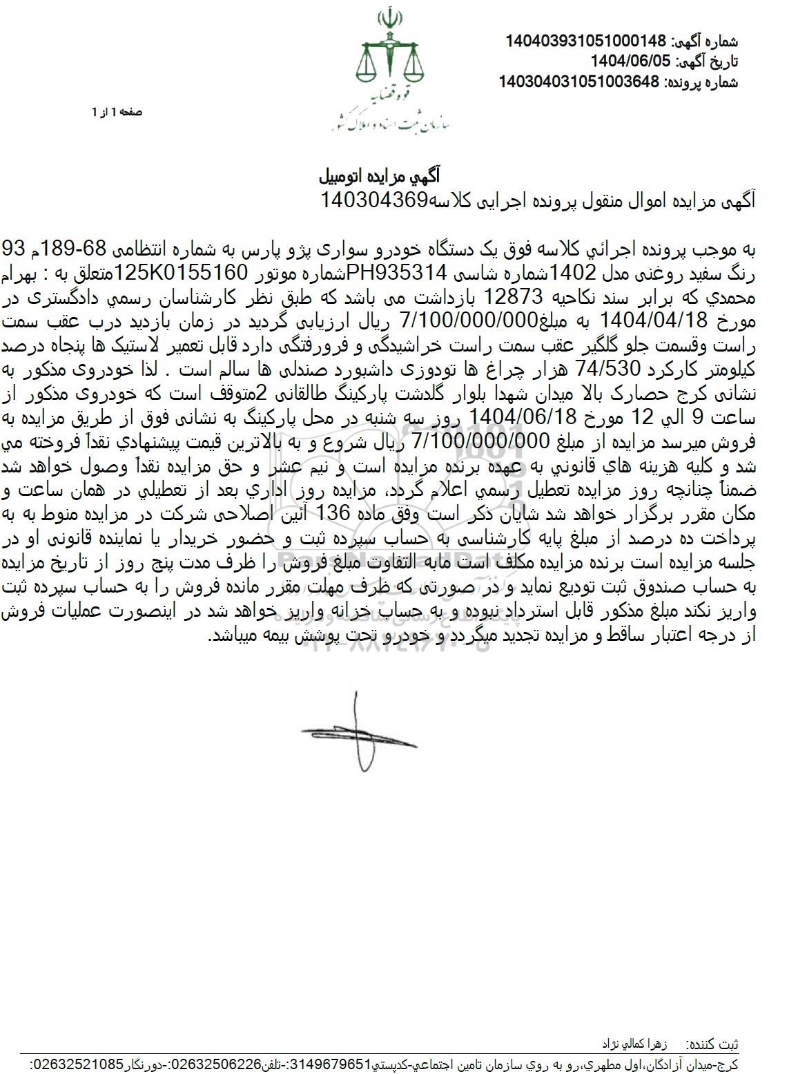 10 مزایده فروش 2 دستگاه خودرو 9699001 1404/07/22 new not special not payed مازندران